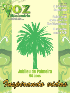 Nossa capa retrata uma Palmeira estilizada – um belo trabalho do nosso diagramador, Hermano Matos –, relembrando o aniversário de 94 anos da revista Voz Missionária – Jubileu de Palmeira. A Palmeira sempre nos remete à sombra, refrigério, descanso e alimento. Ao vermos fotos de palmeiras sempre pensamos em um tempo de descanso à sombra da palmeira.